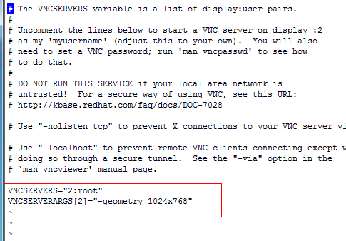 2、修改/etc/sysconfig/vncservers,配置远程管理账号和分辨率等信息。如图,使用root用户,登录分辨率为1027*768