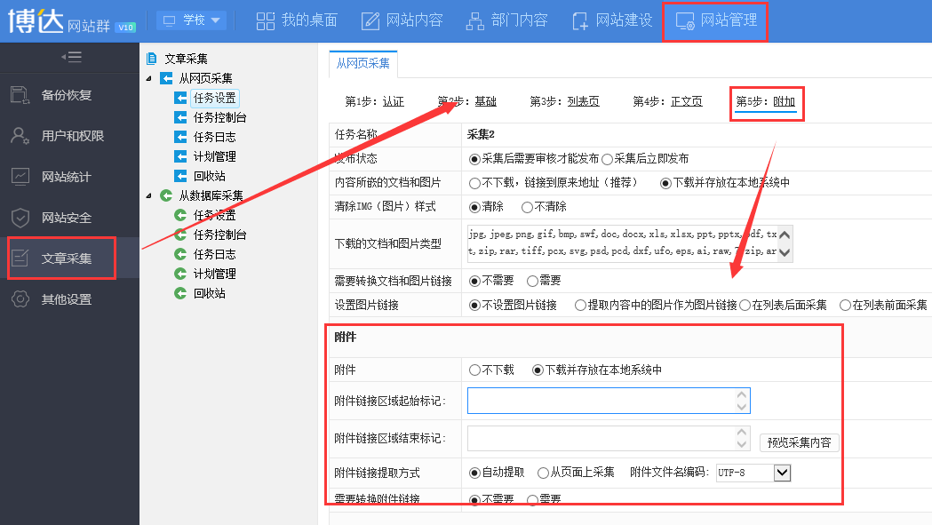 1.登陆网站管理,网站管理-文章采集,从网页采集(任务设置)在采集任务第5步,附件选择下载并存放到本地,输入附件链接的区域的起始和结束标记,并进行预览,预览出来的内容是附件内容,即采集内容正确,进行采集即可