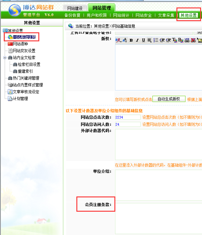 会员注册条款需要在网站管理》其他设置》网站基础信息里设置,网站基础信息页面的最后一项为会员注册条款,在此输入注册条款,点“保存”即可,如图: