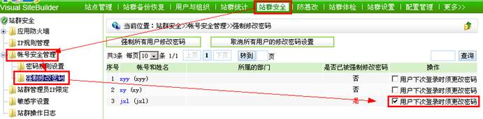 博达网站群站群管理—站群安全—账号安全—强制修改密码处,勾选这一个管理员对应账号后面的“用户下次登录时须更改密码”前的选择框,可以使这个管理员在下次登录时,强制其修改管理员密码。详情见下图: