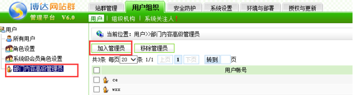 ——用户与组织——部门内容高级管理员——加入管理员即可。