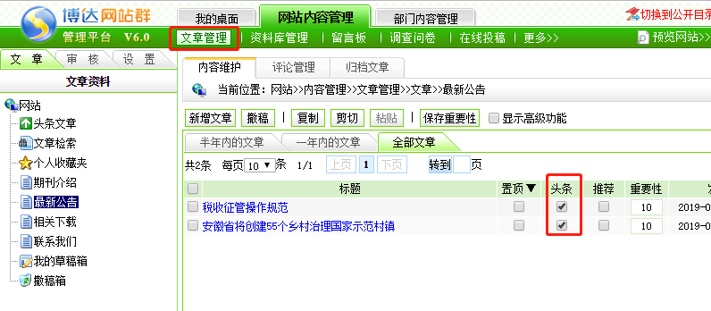 头条:出现在头条文章组件中,可以在【网站内容管理-文章管理-头条文章】中进行管理。