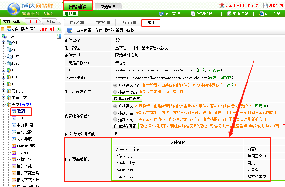 博达网站群管理平台中,网站管理-网站建设-文件/模板处,在组件属性处可以查看该组件被哪几个页面引用。详情如下图所示: