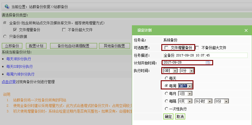 设置全备份计划时,需要将可选配置中‘文件增量备份’去掉,设置增量备份的时候需要勾上;设置任务描述、计划开始时间、执行时间,点击确定即可。