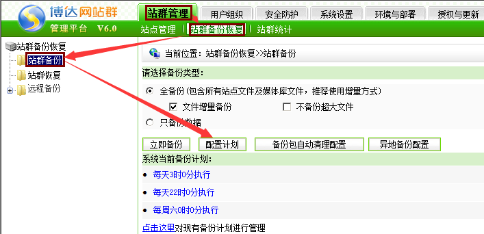 1.登录系统管理后,站群管理--站群备份恢复--站群备份,可以设置备份计划;如图1所示: