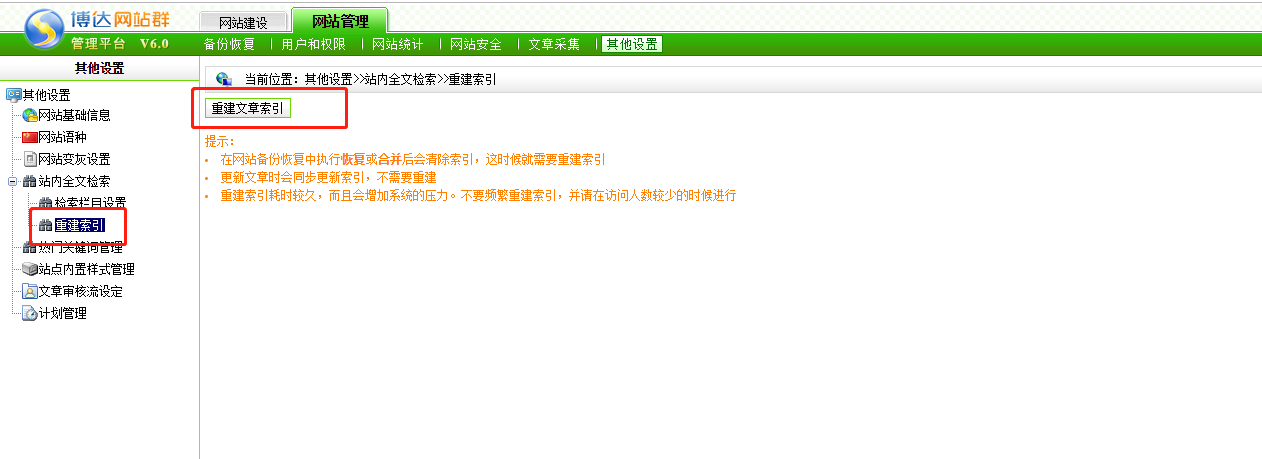 在网站管理处重建索引