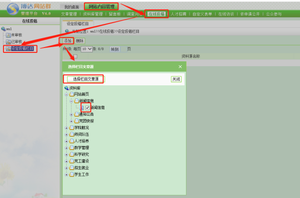 网站内容管理-在线投稿-设定投稿栏目-添加对应栏目