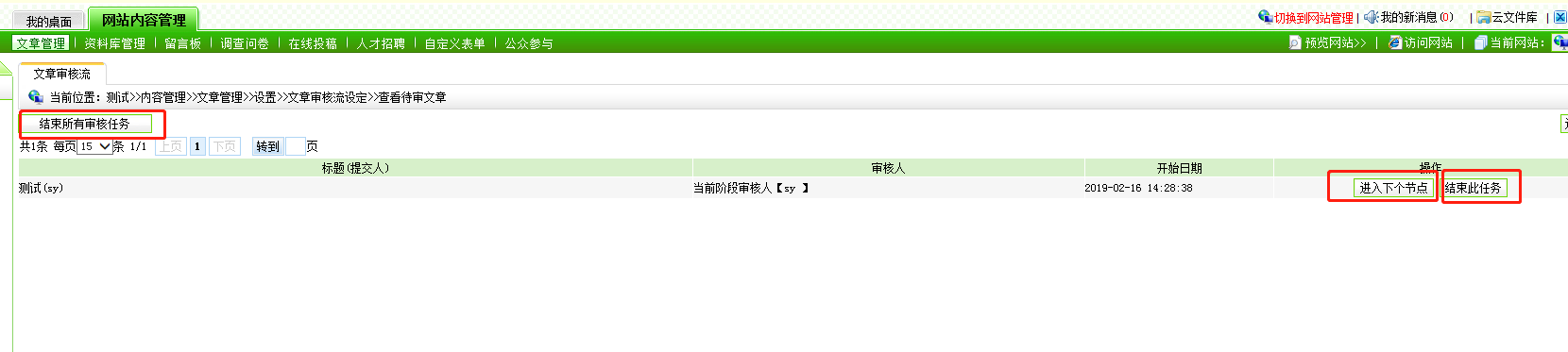进入下个节点是进入审核流下一环节,继续审核或者发布,结束即为去除文章审核,文章为暂存状态。