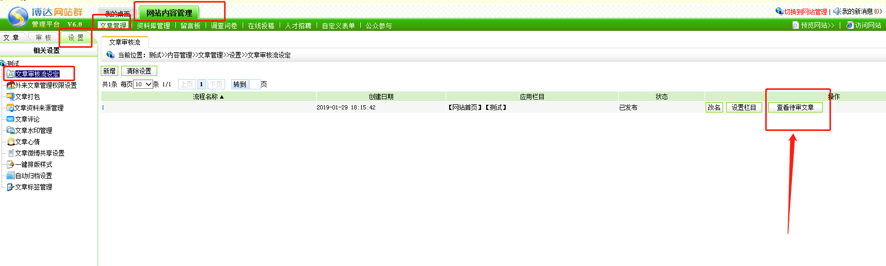 当前审核流中存在文章审核中,因此无法修改流程发布,需要在文章管理-设置-审核流设置中将正在审核中的文章流程结束掉就可以修改审核流发布