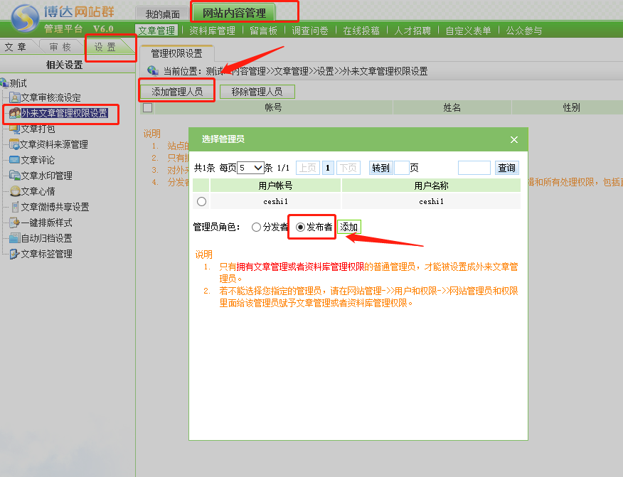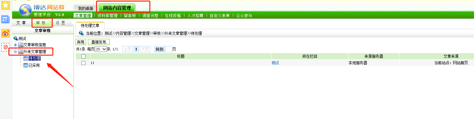 如果看不到待处理文章,可能该账号没有权限,用高级管理员账号给指定账号分配权限