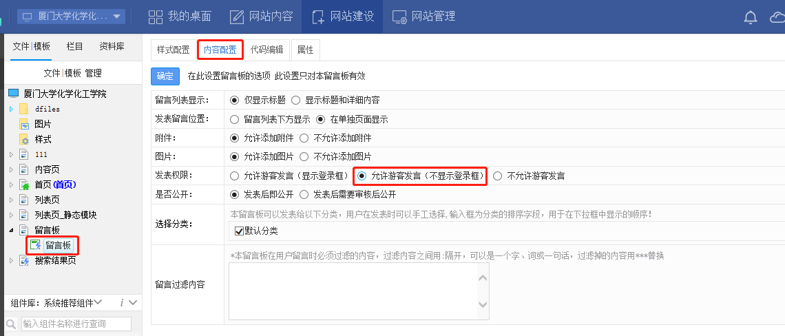 点击留言板组件,在内容配置