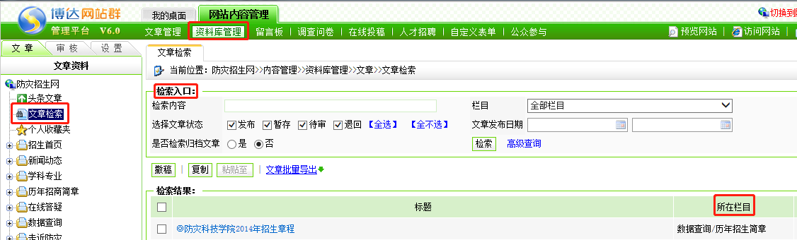 1. 切换到网站内容管理--资料库管理--文章检索--在检索入口输入文章标题;