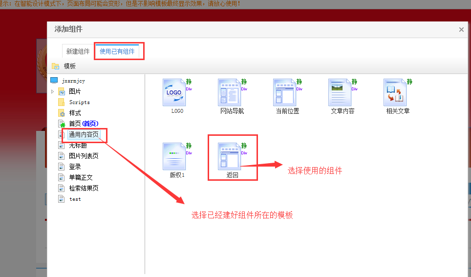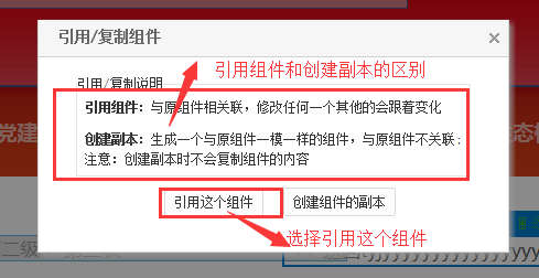 -选择使用已有组件(如下图)-选择已有组件所在的模板-选择引用这个组件或者创建组件副本。引用组件和创建组件的副本区别见下图2: