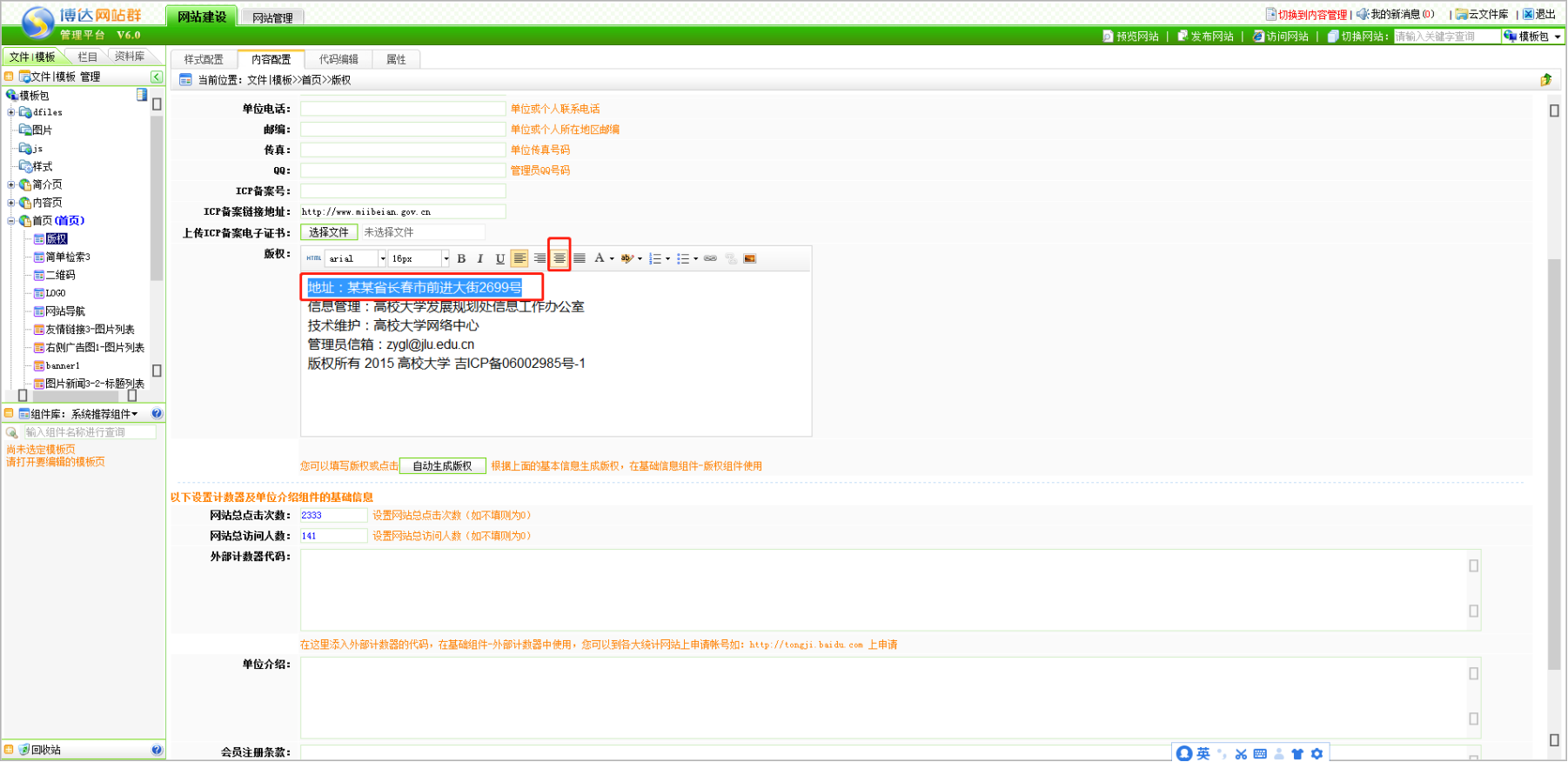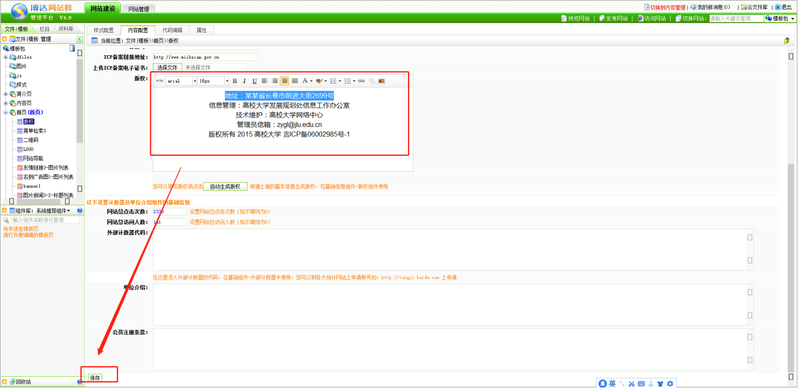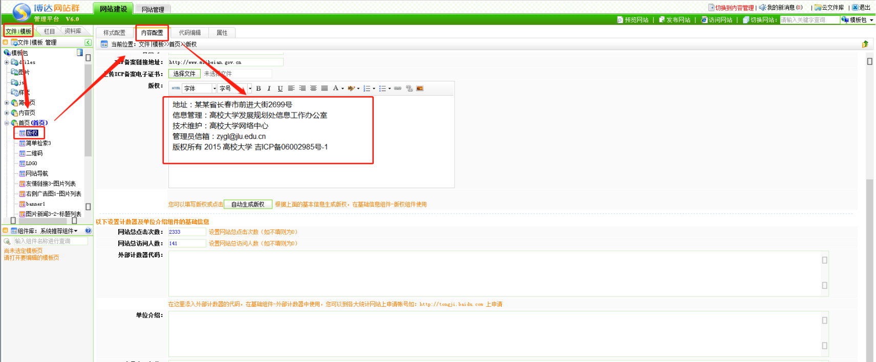第一步:打开版权组件,点击内容配置;