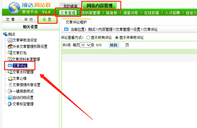 在内容管理-文章管理-设置-文章评论处可以管理