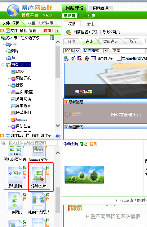 在组件库中---栏目资料组件----图片列表---选择浮动图片组件即可