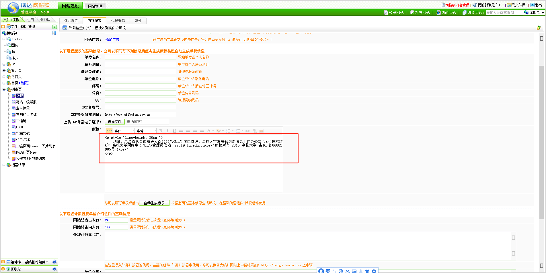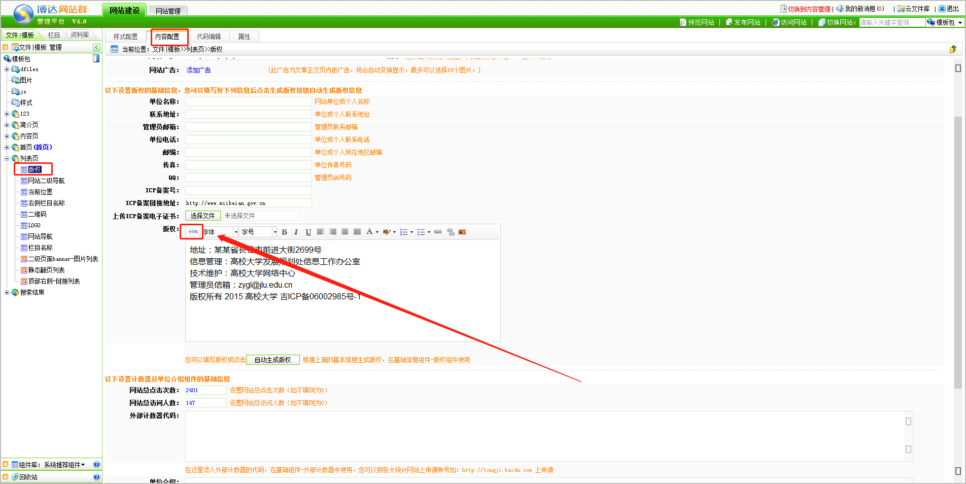 第一步:打开版权组件内容编辑的源码;