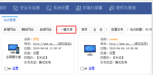 登录系统管理-站群管理-所有站点-点击一键关停操作,停止效果如下图