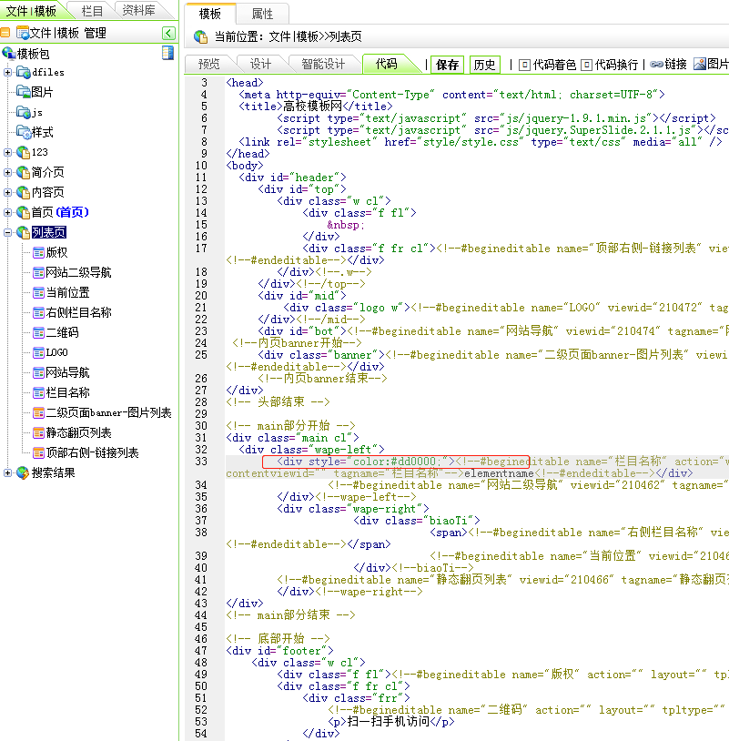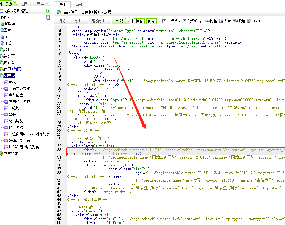 第一步:打开栏目名称所在的模板页面的代码,找到栏目名称的上一级标签(此处栏目名称的上一级标签是div);