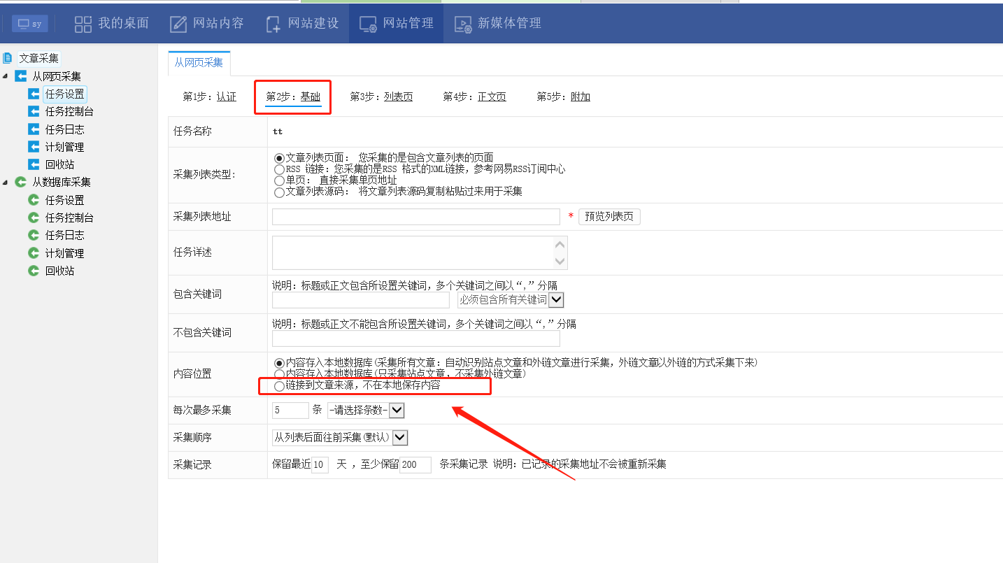 在采集任务的第二步选择内容链接到文章来源
