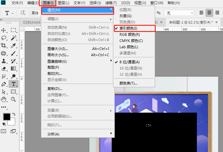 第一步:左上角找到图像——模式里面会发现索引颜色前面打了对勾,这时候需要选择RGB颜色或者CMYK颜色;