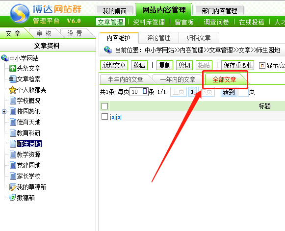 打开文章管理的页面,点击想要查看文章所在的栏目,在文章列表上方点击全部文章,便可以看到所有的文章;
