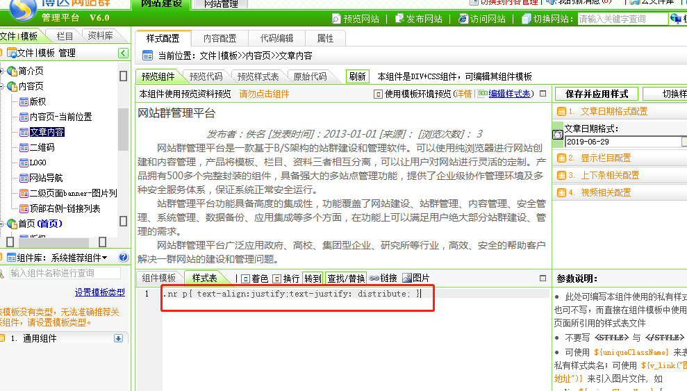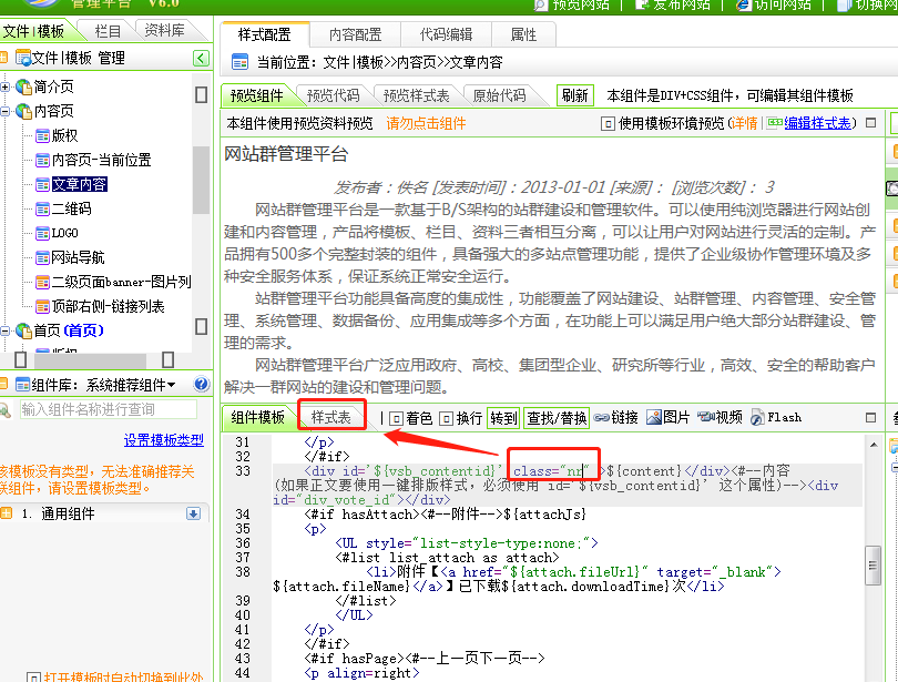 第一步:打开内容页的文章内容组件,找到内容的字段,给内容添加一个class="nr"(意思是给内容起一个名字,双引号里面就是此名字的名称,此处就以nr名字为例),然后点击样式表;
