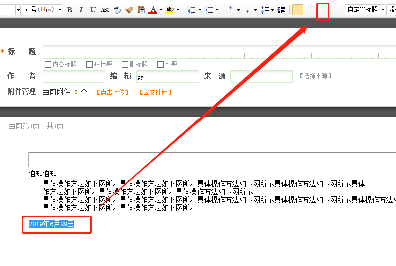 第一步:打开编辑文章的页面,选中最后一行,点击编辑器上方的居右显示按钮,就可以让最后一行段落靠右显示了;