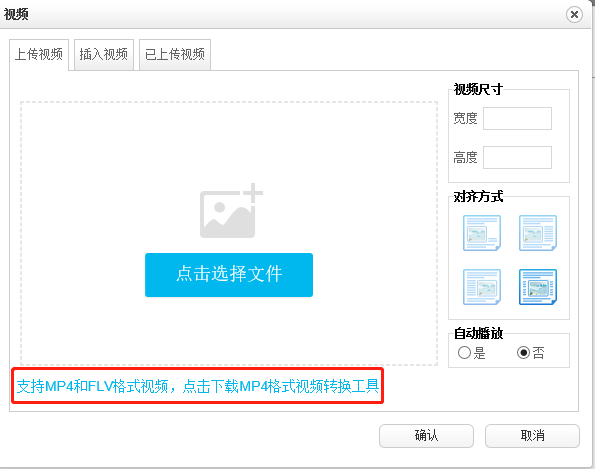 注:1可调整视频的尺寸,对齐方式和是否自动播放,一般建议自动播放为否,这样不影响前台访问,否则前台访问会很慢
