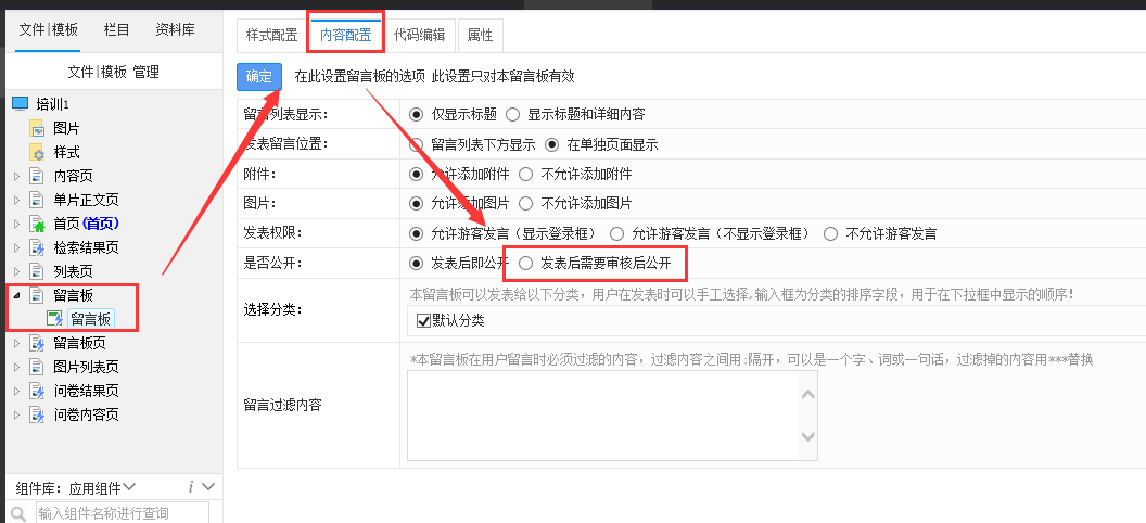 1.登陆网站管理-网站建设,找到放置留言组件的模板,点击留言板,选择内容配置,选择需要审核后公开,保存即可