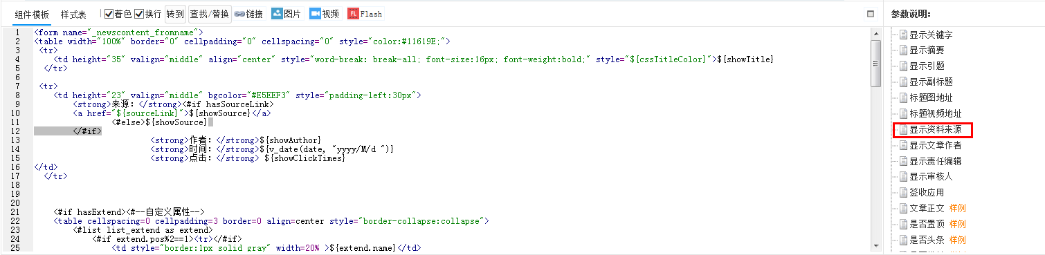 在内容页模板文章内容组件添加显示资料来源参数,样式自行调整即可,如图所示: