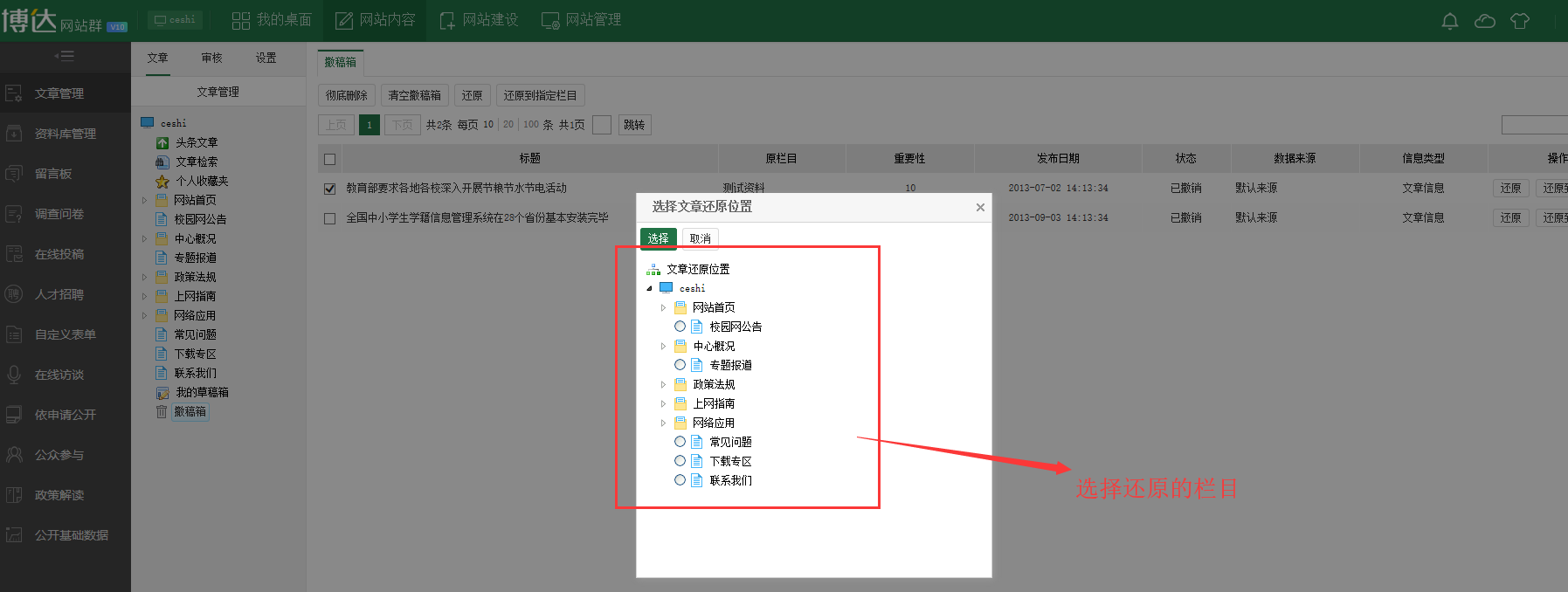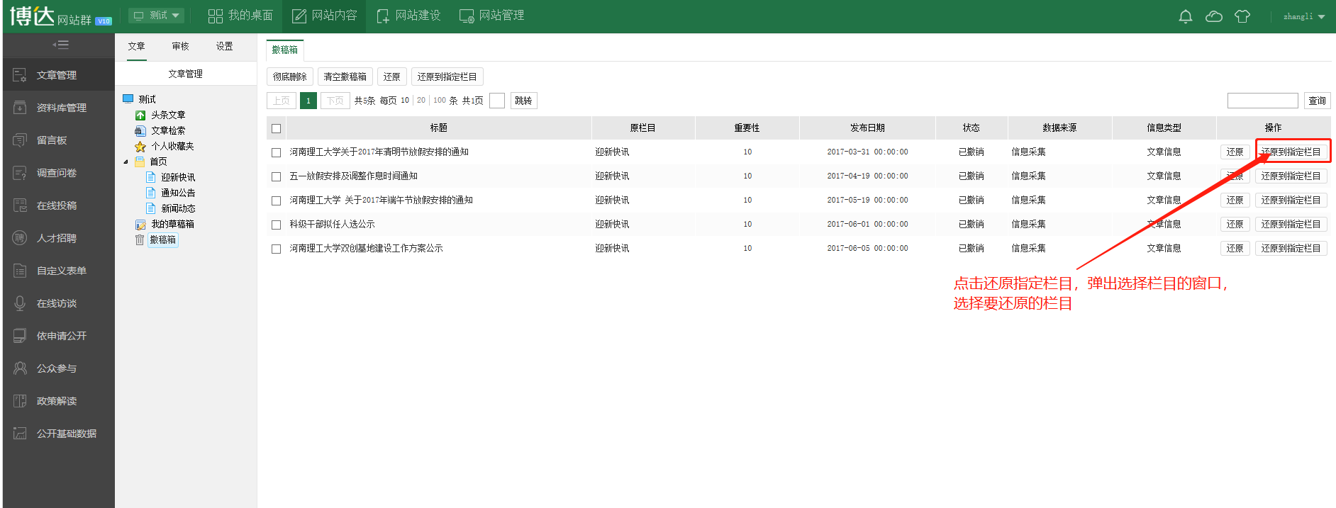 文章撤稿后如果还原到指定栏目?
