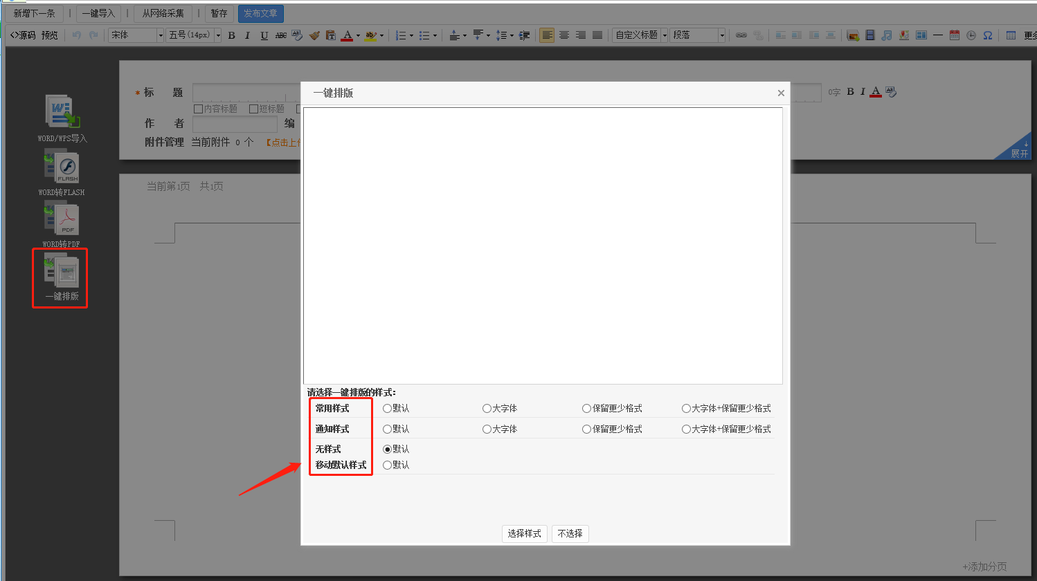 在文章编辑器中,应用一键排版,可以预览选择合适的样式,如图所示: