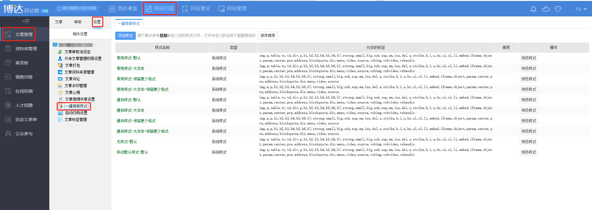 也可以在网站内容—文章管理—一键排版样式—添加样式中添加需要的样式