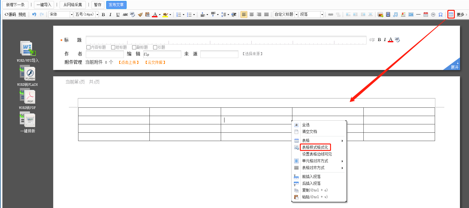 在文章编辑器中,选择插入表格后,选中表格鼠标点击右键,如图所示,点击表格样式格式化,