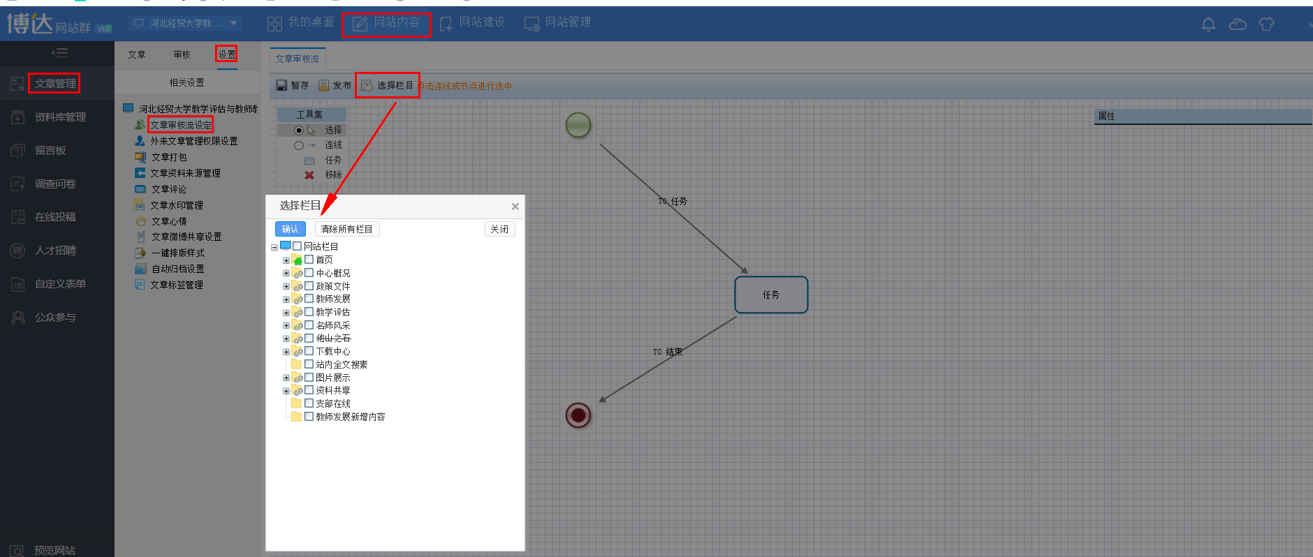 在网站内容-->文章管理-->设置-->文章审核流的设定下,创建或者是在已有的一个审核流中,点击选择栏目将想要审核的栏目添加上即可,如图所示