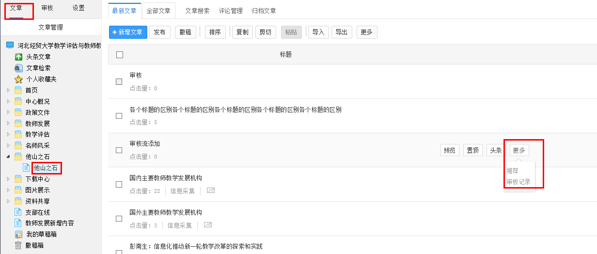 在文章管理-文章栏目-文章标题列表处找到审核后的文章,点击文章列表后审核记录按钮,即有审核记录的弹出框,如图所示: