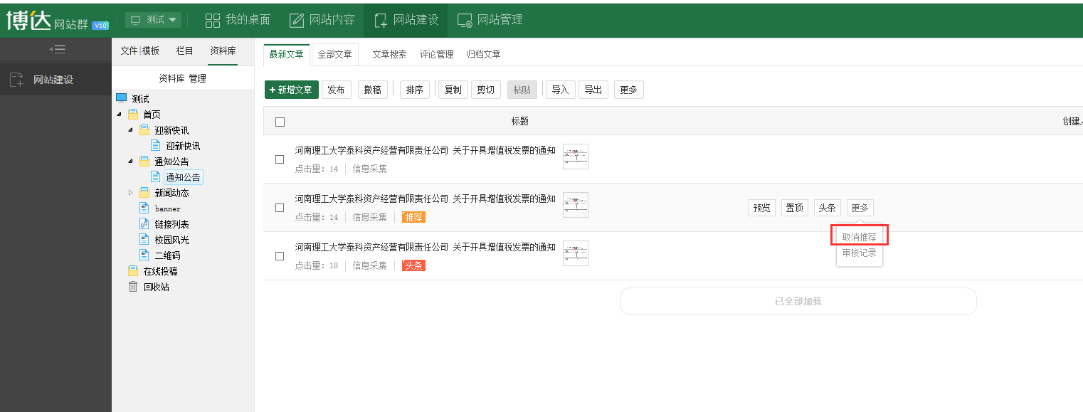 1.网站内容》文章管理,鼠标放到文章上边,点击更多,弹出如下窗口,点击取消审推荐