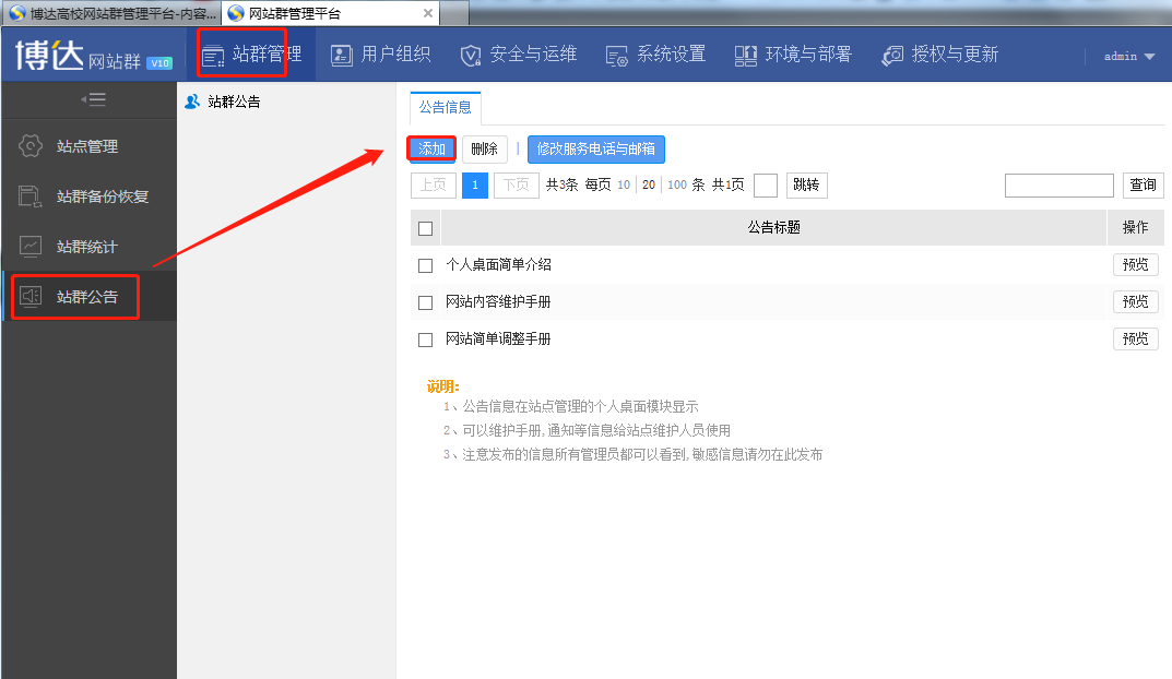 登录网站群系统管理后台,站群管理——站群公告,进行添加或修改站群公告