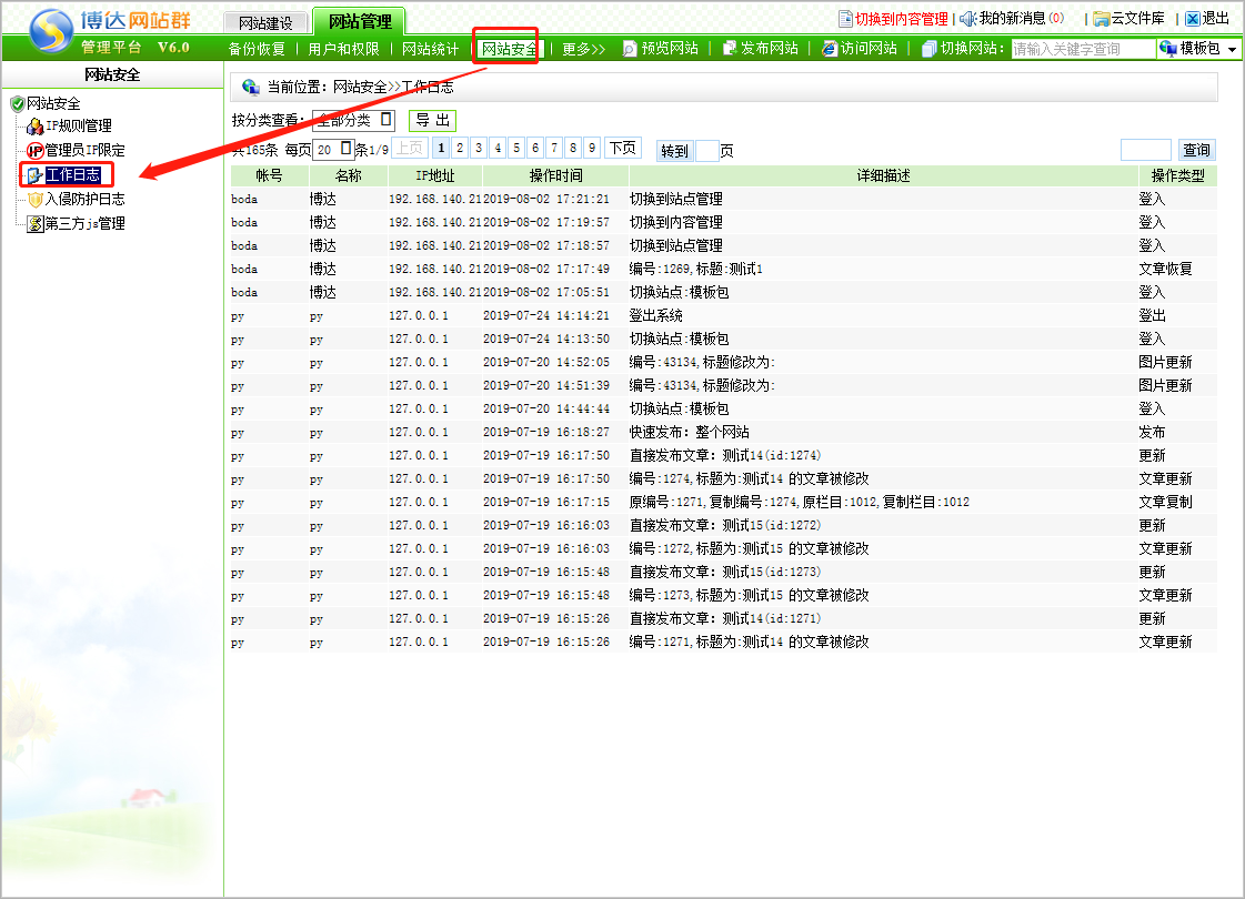 登录到网站管理后台——网站安全——工作日志,进行查看文章撤稿、恢复等的记录。