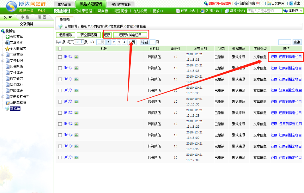第一步:在文章管理栏目下方点击撤稿箱,对已经撤稿的文章进行还原,点击还原可以还原到文章原先所在的栏目,点击还原到指定栏目可以进行选择想要还原的栏目。