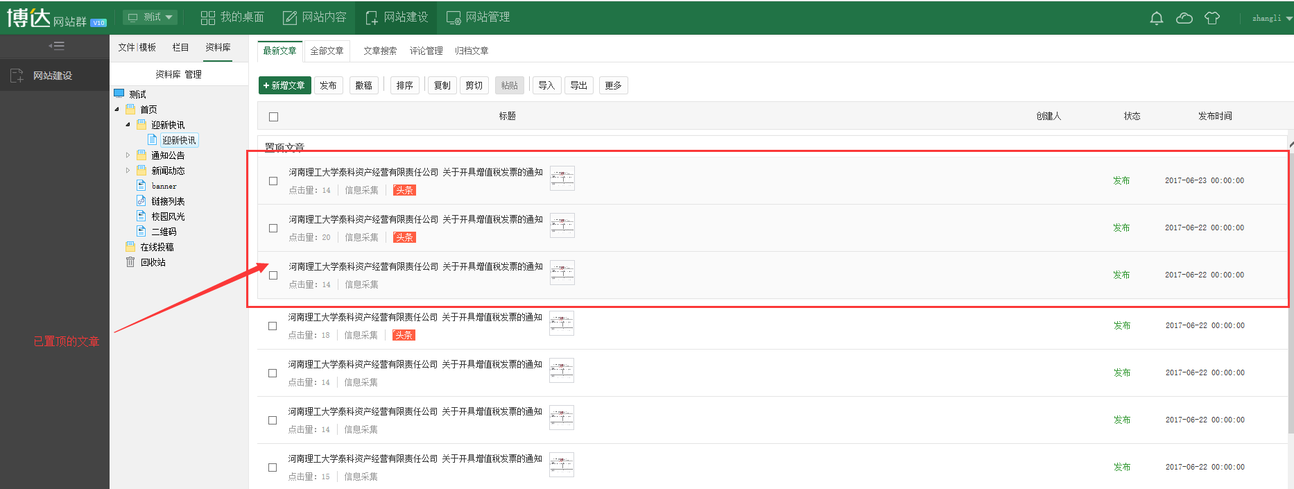 v10中文章置顶后在哪里显示?