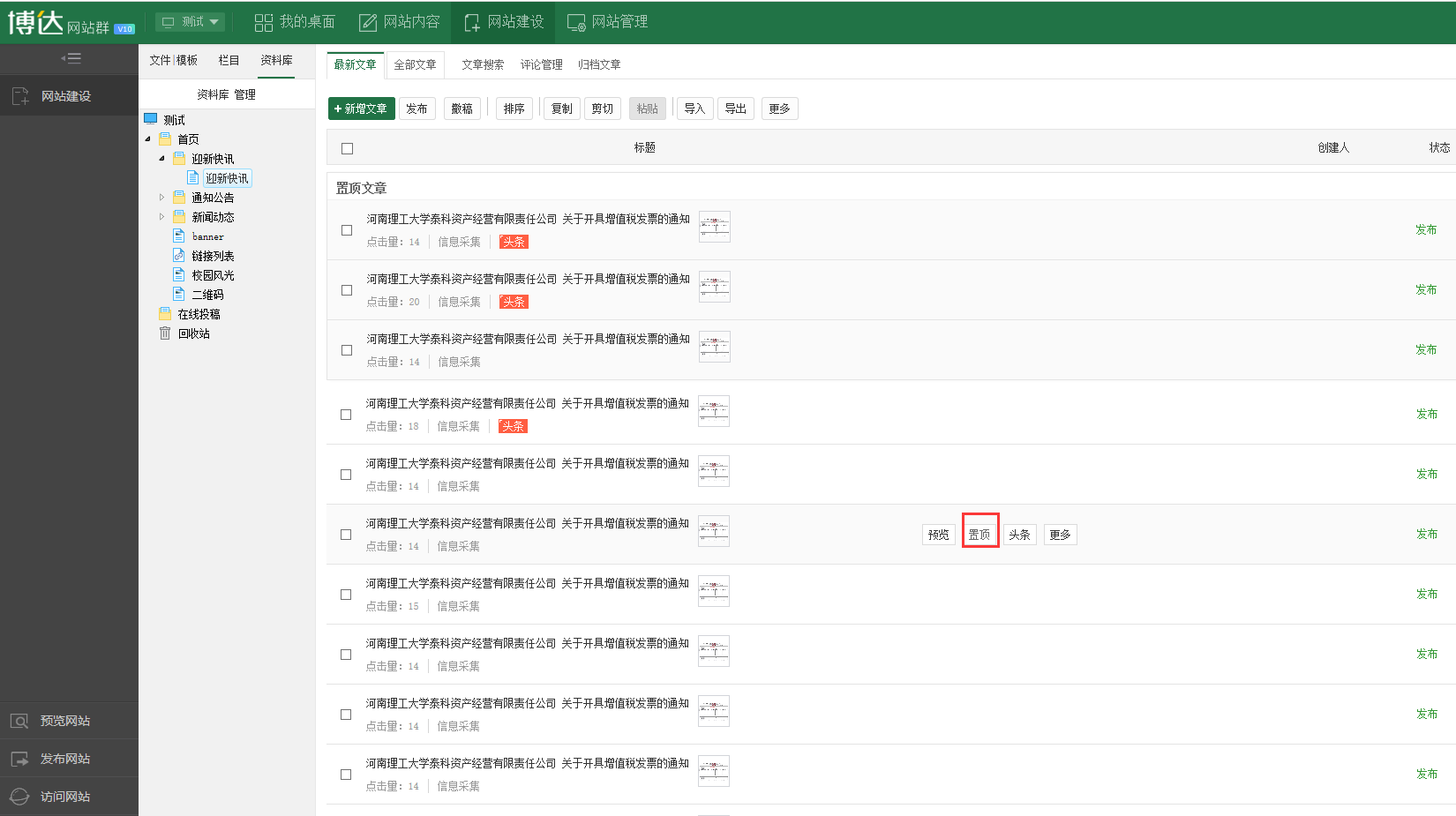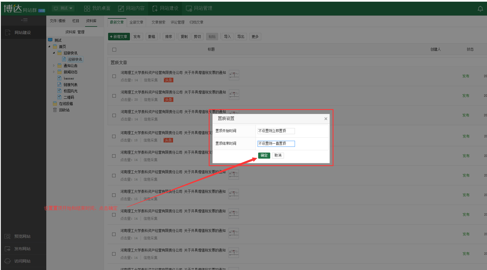 1.网站内容管理》文章管理,或是网站建设》资料库;鼠标放到文章上面,点击置顶,弹出图2,选择置顶开始和结束时间,点击确定。