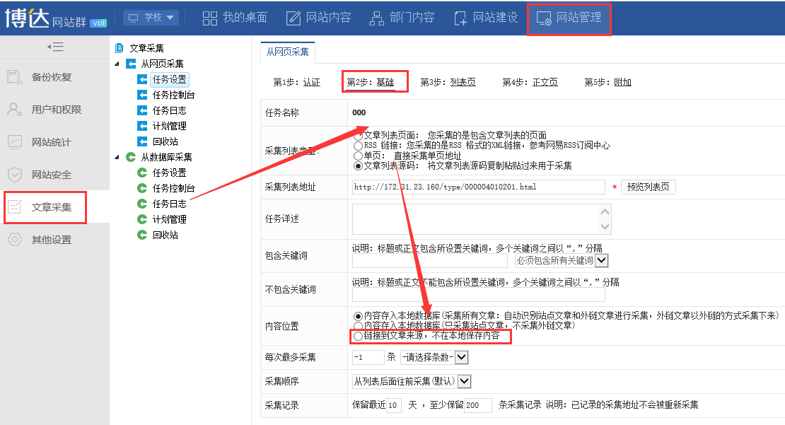 1.登陆网站管理,网站管理-文章采集,在采集任务第2步内容位置选择链接到文章来源,不在本地保存