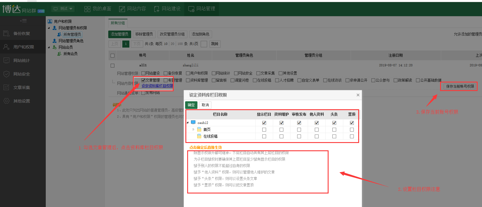 1.网站管理》用户与权限》网站管理员与权限;(1)勾选文章管理,点击设定栏目权限(2)弹出窗口,给网站管理员添加对应栏目的文章权限(设定资料库权限的时候注意提示),设置好之后点击确定;(3)点击保存当前账号权限。