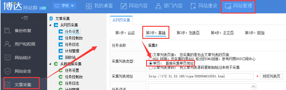 普通列表采集在第2步采集列表类型选择的是文章列表页面采集,而单篇正文选择的是单页进行采集