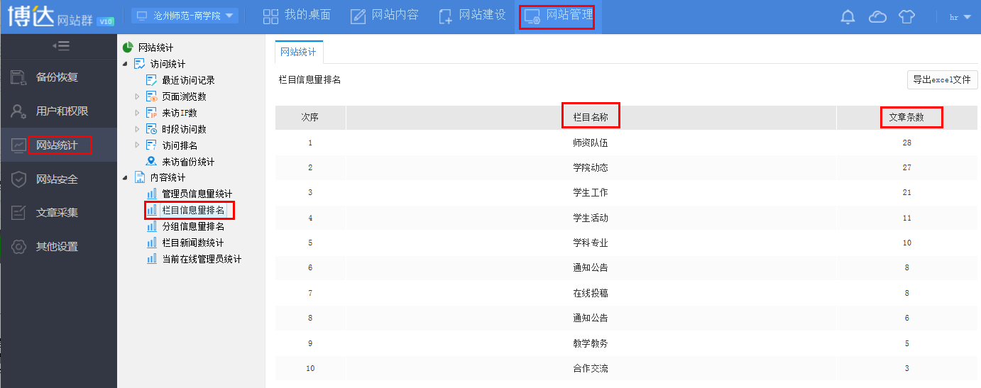 在网站管理-->网站统计-->内容统计下点击栏目信息量排名即可看见本网站各个栏目发布文章的数量,如图