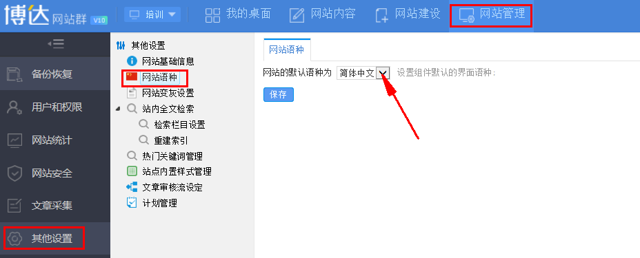 在网站管理-->其他设置-->网站语种中可以修改网站语种,如图:
