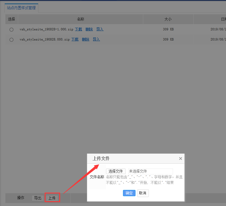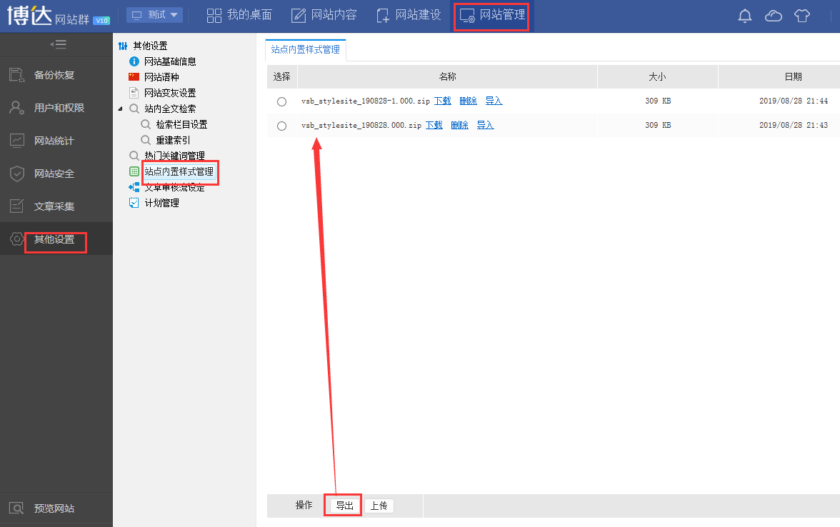 在网站管理-->其他设置-->站点内置样式管理可以将本站点的样式包导出,如图: