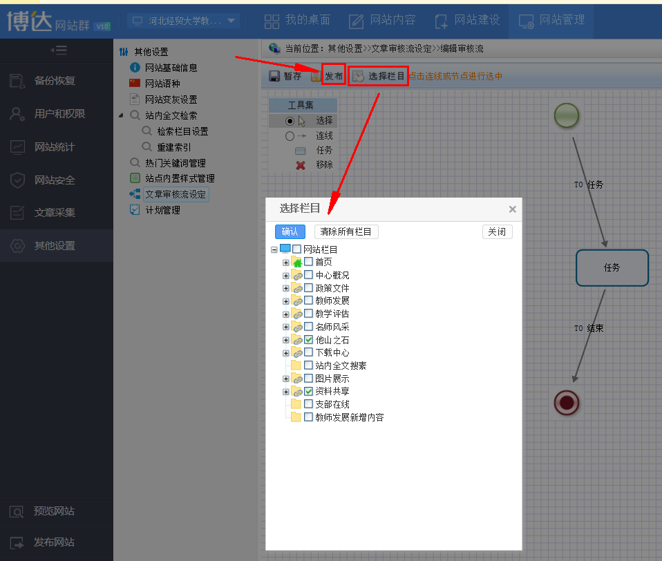 在审核流中选择栏目处添加上要审核的文章,发布新建的审核流,如图